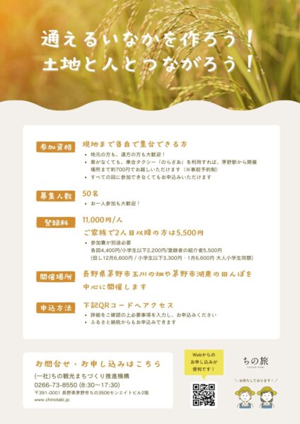 | 申込方法 | 【詳細・お申込みHP】 信州八ヶ岳の麓から 一緒に!つなぐ プロジェクト2026 | ちの旅 ※詳細をご確認の上必要事項を入力し、お申込みください。 ※ふるさと納税を利用してお支払いいただくことも可能です。 |
